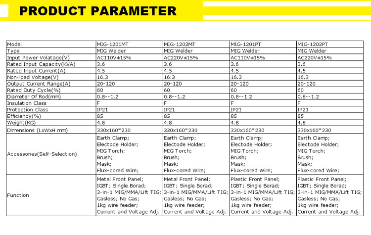 ·MIG/MMA/TIG, Gasless and Flux-Cored Wire Only for MIG.