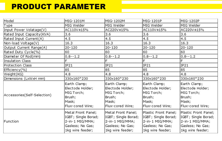 ·MIG/MMA, Gasless and Flux-Cored Wire Only for MIG.