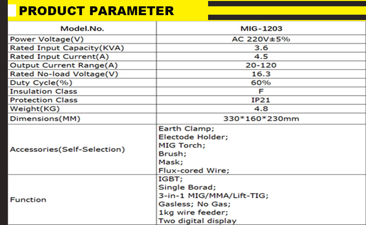 ·MIG/MMA/TIG, Gasless and Flux-Cored Wire Only for MIG.
