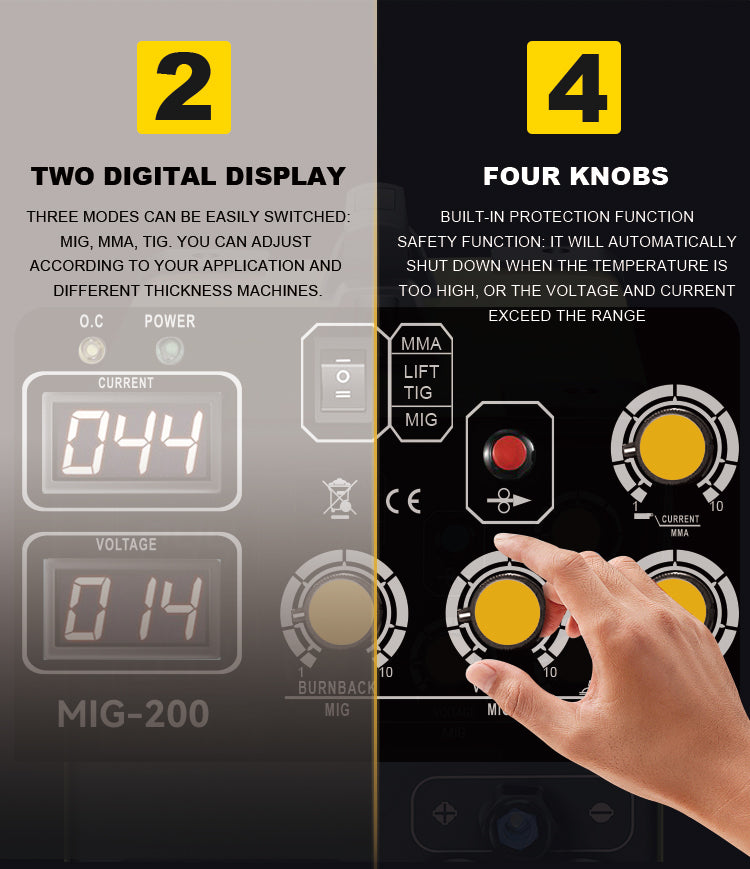 ·3 IN 1 Welder Three modes can be easily switched: MIG, MMA, TIG. You can adjust according to your application and different thickness machines.