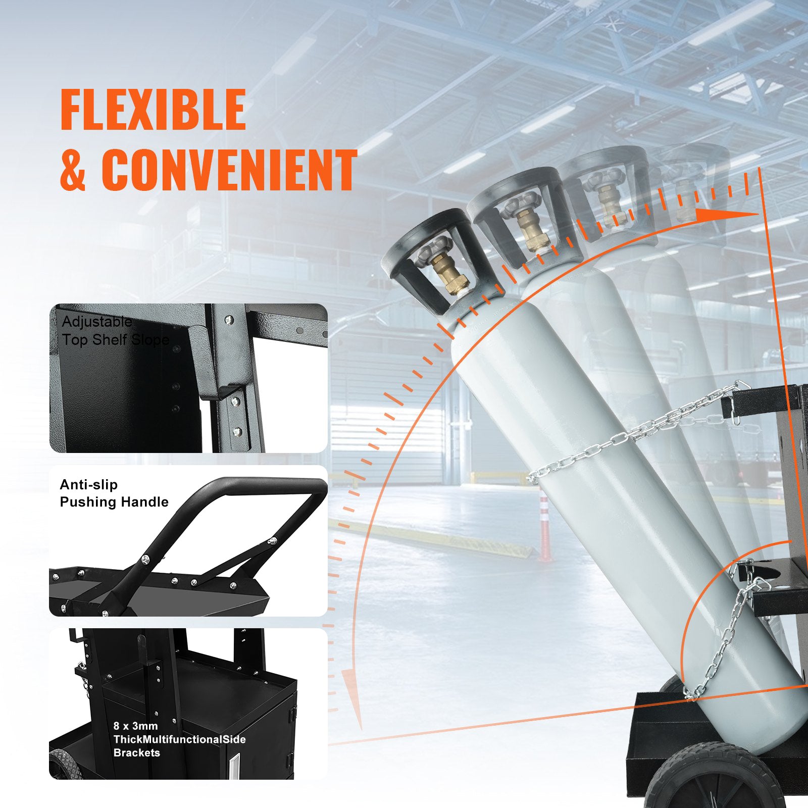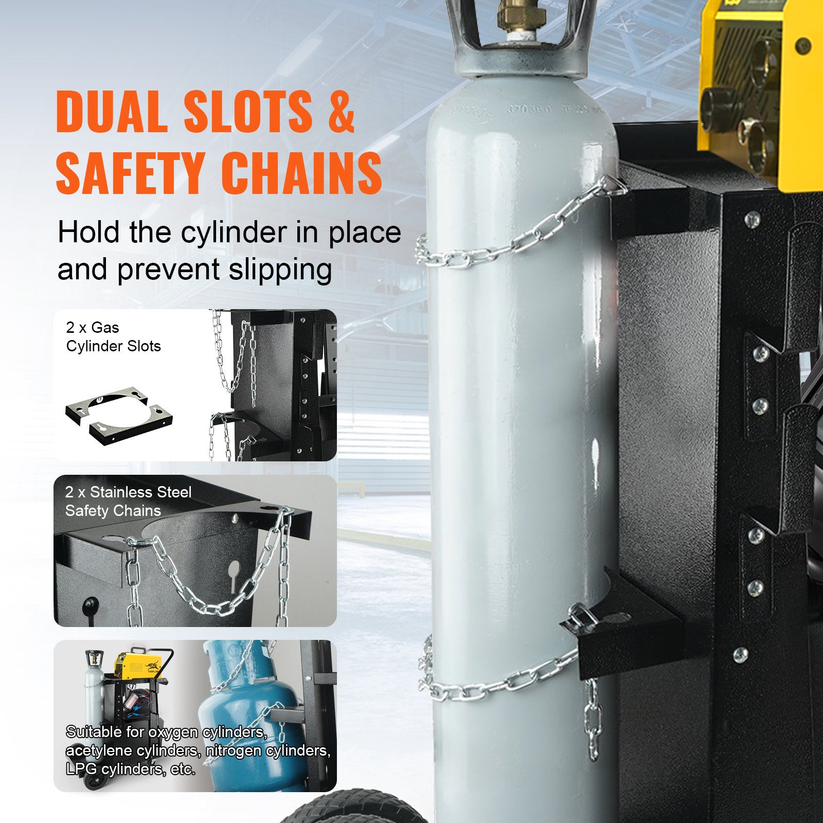 ·Trzy warstwy do umieszczania, zróżnicowane funkcjonalne obszary do przechowywania, starannie ułożone spawarki i narzędzia, wyposażone w łańcuchy do mocowania butli gazowych.