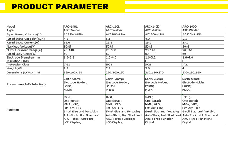 ·Functions: Hot Start, Arc-Force, MMA, VRD, Lift-Tig, Wire choose: 2.0/2.5/3.2.